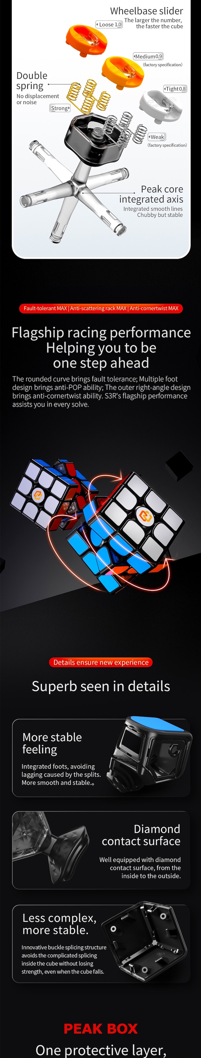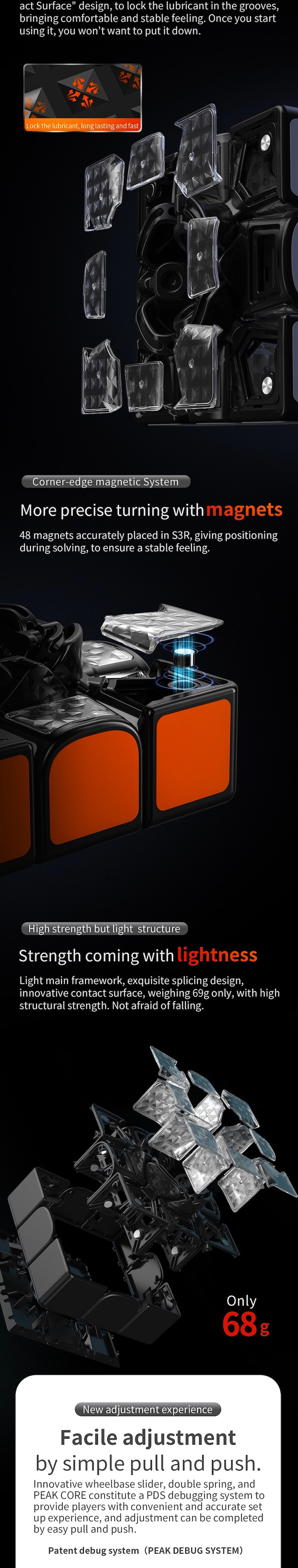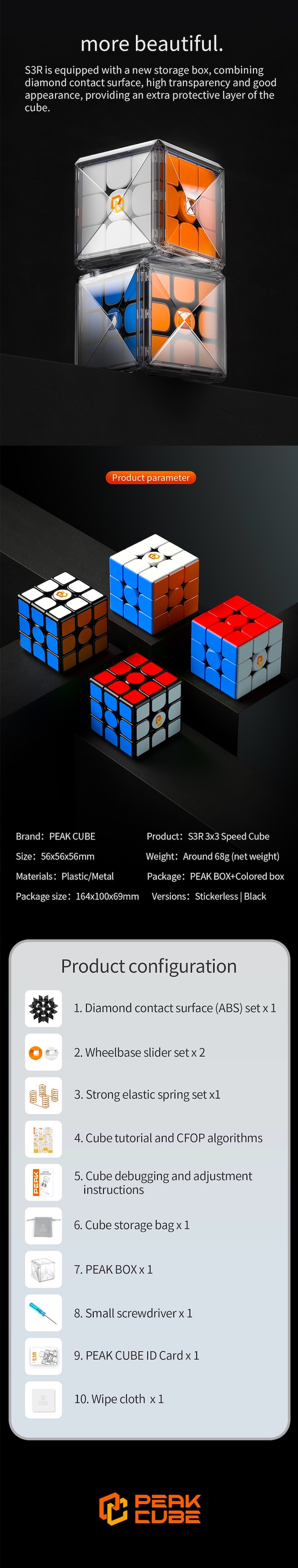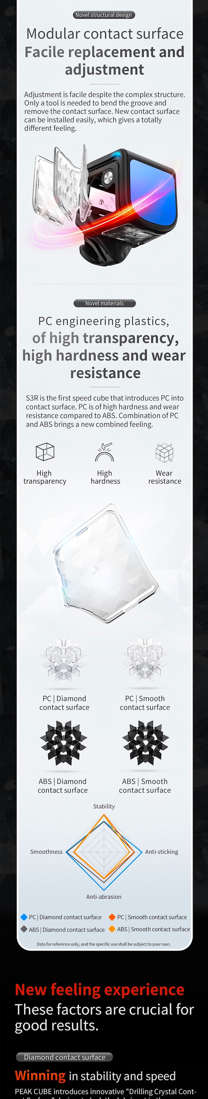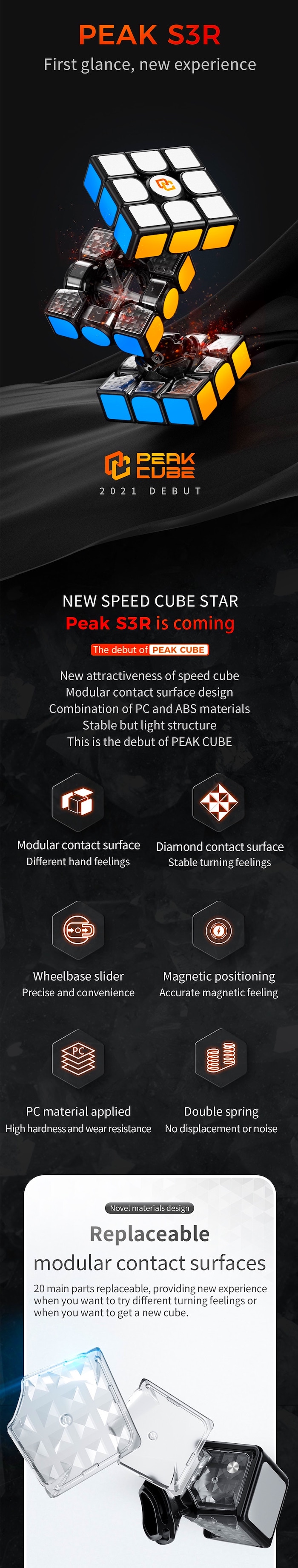 Det nye mærke Peak Cube debuterer i cubing-branchen med deres model kaldet Peak Cube S3R! Denne speedcube er helt unik, og det er tydeligt, at Peak Cube har valgt at træde ind på cube markedet, fordi de har idéer, som kan forbedre fremtidens speedcubes. Terningen drejer utroligt godt, og den har mange gode justeringssystemer, som gør, at modellen er en pragtfuld speedcube, men det der virkeligt springer i øjnene ved denne model er, at den har udskiftelige overflader. Dette betyder, at du kan vælge den overfladetekstur, som du synes giver den bedste fornemmelse når du roterer terningen. I kombination med terningens fantastiske drejeevne, er denne unikke og anderledes speedcube blandt de bedste debuter, vi har set, og vi glæder os hos MasterCubeStore enormt meget til at se, hvad Peak Cube har at byde på fremover.
