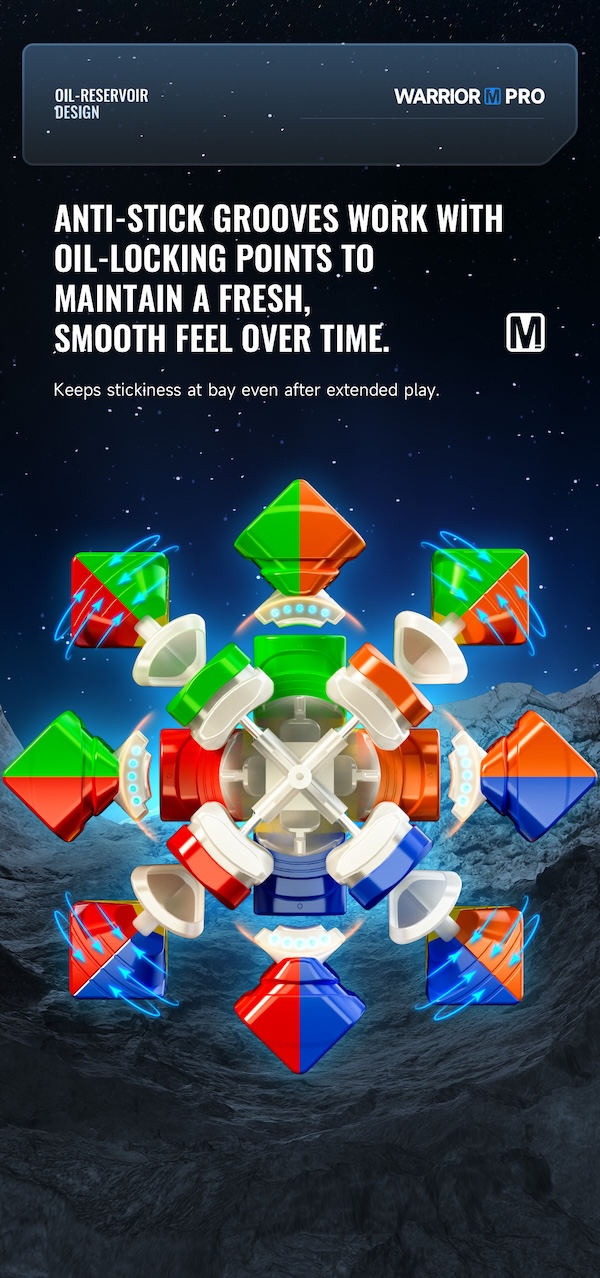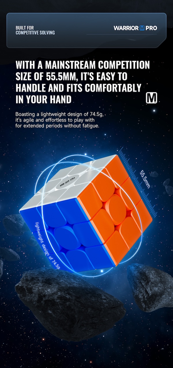QiYi Warrior M Pro 3x3 er en prisvenlig magnetisk speedcube med høj ydeevne, velegnet til både begyndere og øvede. Har et dobbelt justeringssystem med 11 spændingsindstillinger og 48 indbyggede magneter. Fremragende corner cutting og letvægtigt design (ca. 74 g) gør den komfortabel til længere solves.
